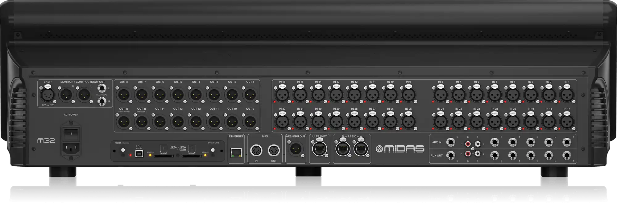 Beyond its 32 rear-panel XLR inputs and comprehensive output complement, the M32 LIVE supports massive expansion through AES50 networking (up to 96 inputs and 96 outputs). Connect to Midas DL-series stage boxes for that authentic Midas sound from stage to console, or integrate with compatible stage boxes from partner brands. The built-in 32×32 USB audio interface transforms the console into a powerful recording platform, while SD card recording provides convenient stereo capture or virtual soundcheck playback.