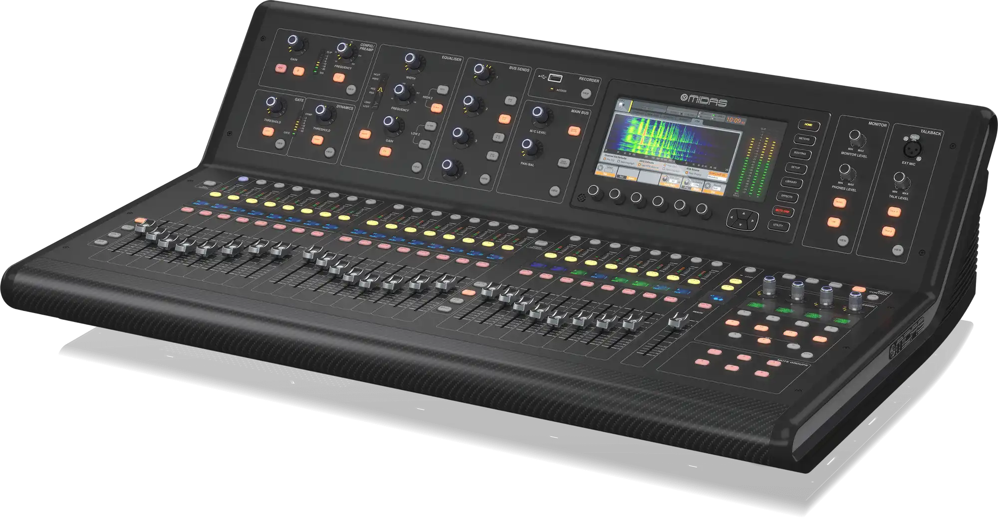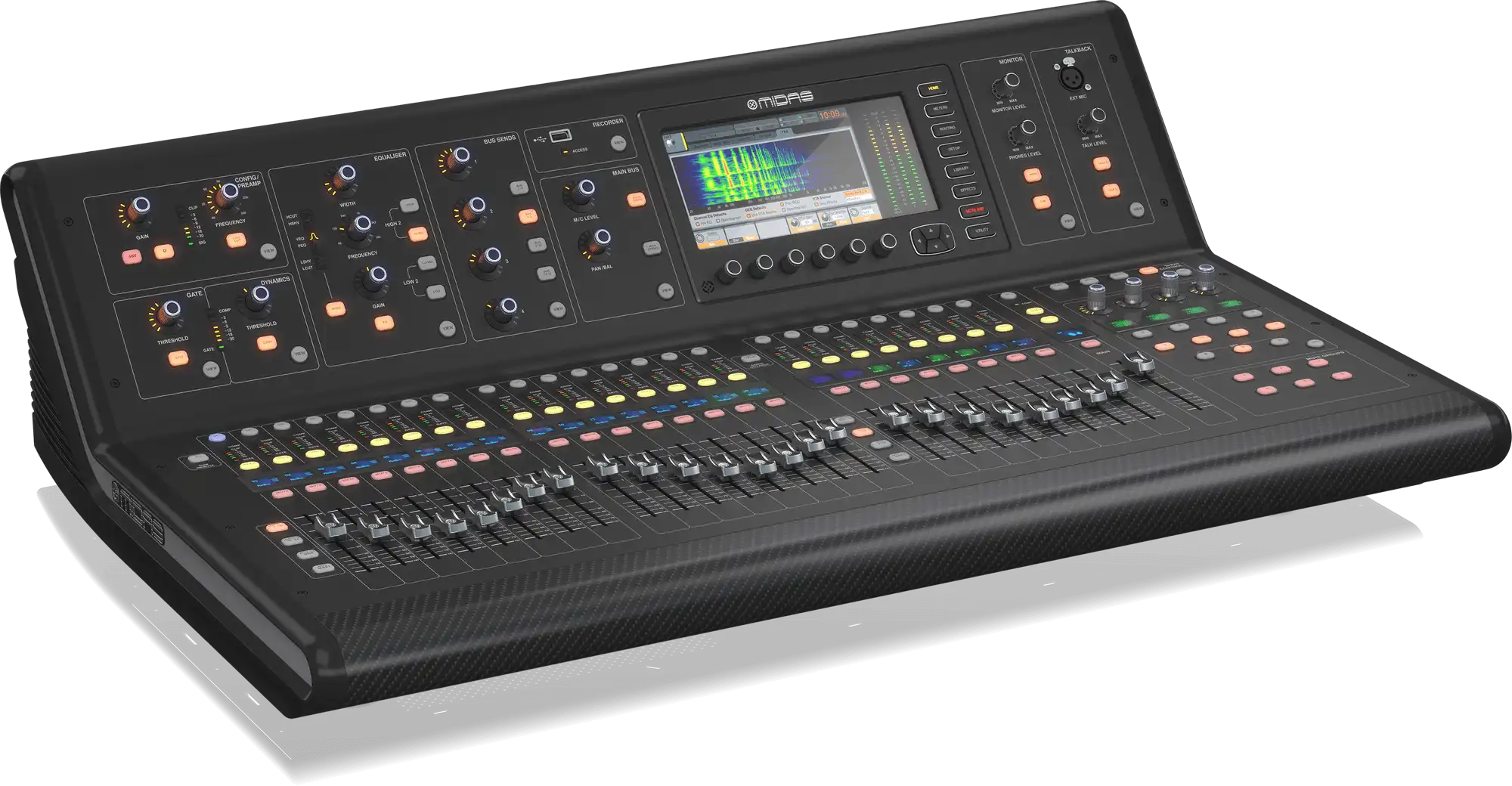 The M32 LIVE distinguishes itself through meticulous attention to component quality. The 25 motorized faders are custom Midas PRO-grade 100mm units rated for one million cycles – dramatically more durable than standard digital console faders and delivering ultra-smooth, precise control that feels like premium analog. Every knob, button, and encoder reflects Midas’s uncompromising approach to tactile quality and long-term reliability.