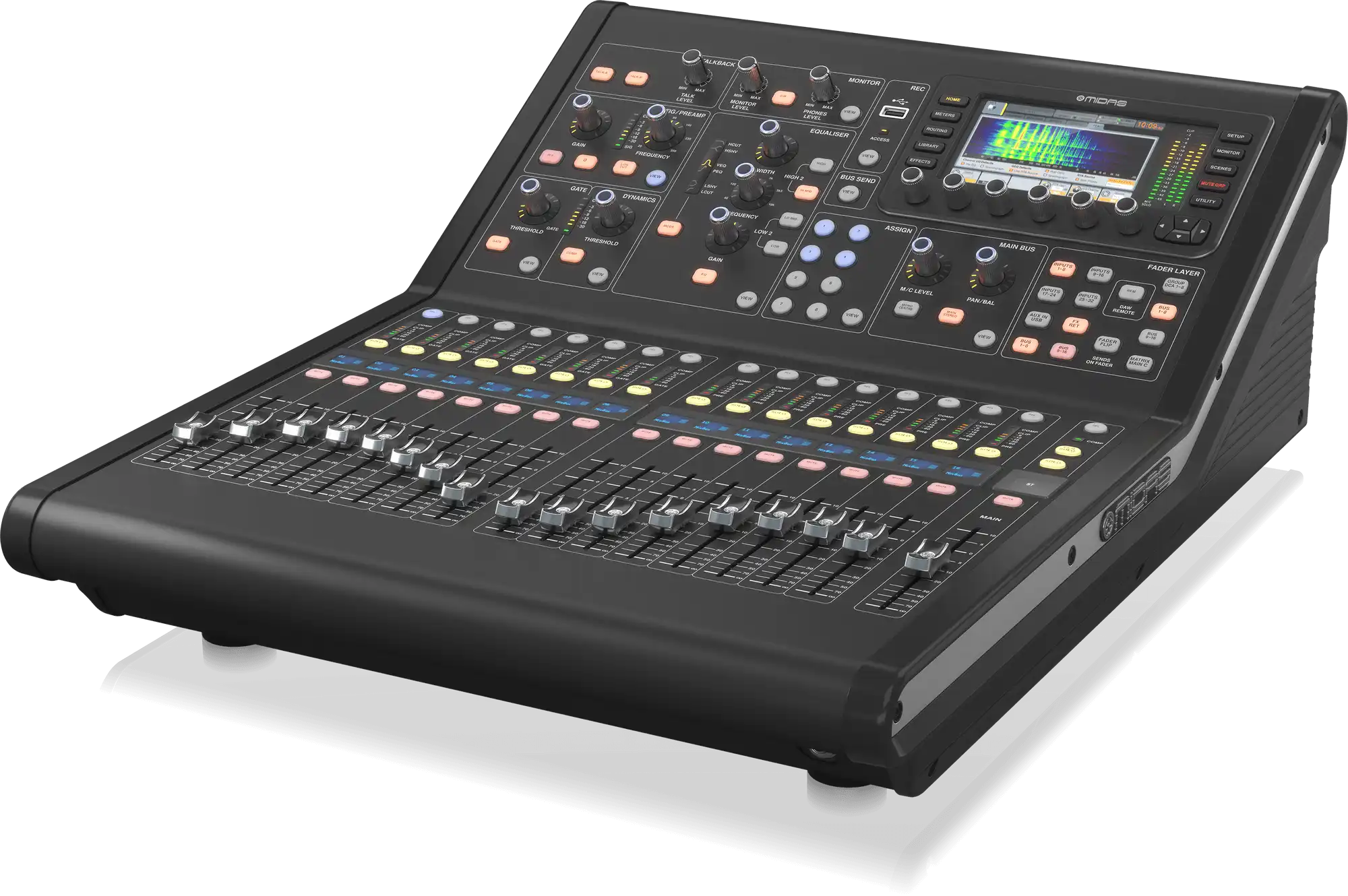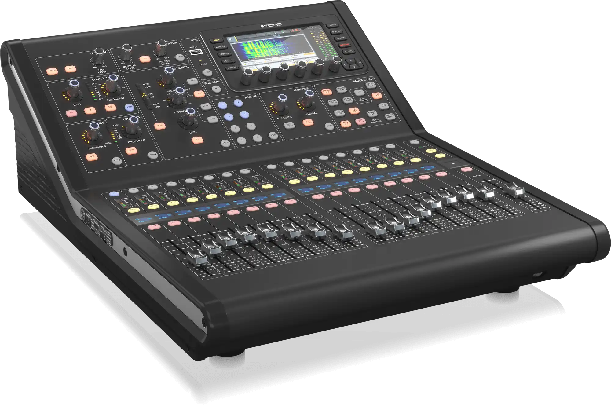 The M32R LIVE delivers 40 input channels and 25 mix buses with 40-bit floating-point DSP processing – giving you 8 aux buses, 6 matrices, and main LRC configuration. Eight DCA groups and six mute groups make managing large shows effortless from the compact surface. Every channel features parametric EQ, gates, and compression, while eight true-stereo effects engines based on Midas’s True Physical Modeling technology provide emulations of legendary processors like the Urei 1176, Teletronix LA-2A, Fairchild 670 compressors, and Pultec EQs. As one reviewer put it: “there’s no reason to haul around a ton of outboard gear when you’re mixing on a Midas M32R.”
